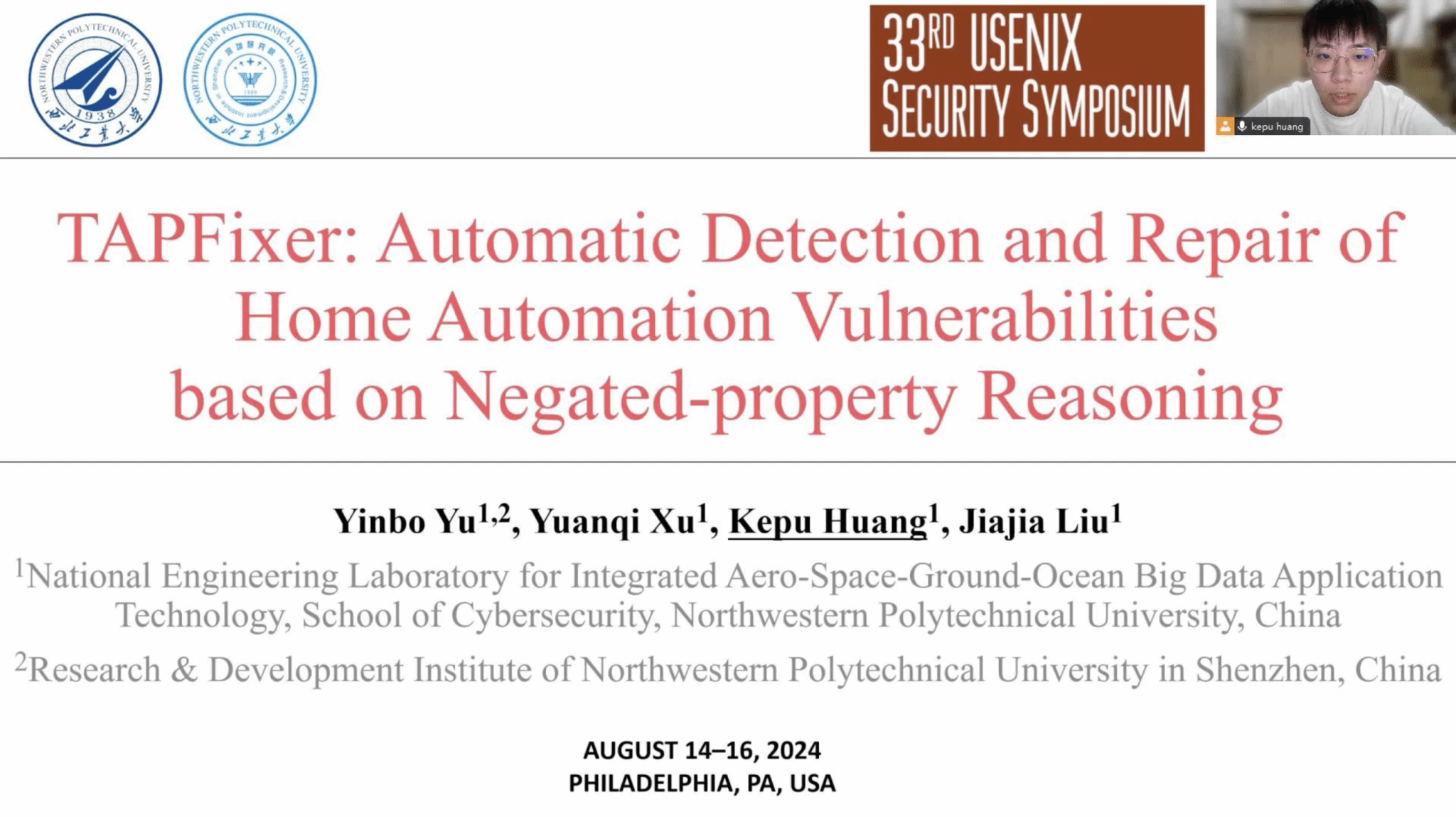 第33届国际网络安全顶会USENIX Security于2024年8月14日-16日在美国宾夕法尼亚州的费城召开。太阳成tyc122cc于银菠副教授研究成果“TAPFixer: Automatic Detection and Repair of Home Automation Vulnerabilities based on Negated-property Reasoning”全文被USENIX Security大会正式发表,2023级硕士研究生黄柯蒲作大会报告。该论文是于银菠副教授专注于网络与软件安全领域研究所取得的重要成果之一,也是太阳成tyc122cc第一篇作为第一完成单位的四大安全顶会文章。论文第一作者为于银菠副教授,2021级硕士研究生徐源琪和2023级硕士研究生黄柯蒲分别为员工第一作者和第二作者,刘家佳教授参与论文指导。