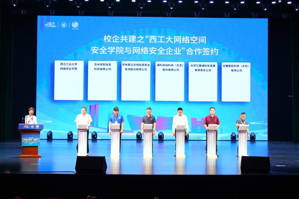 获得江苏省工信厅2021年度“数动未来”融合创新平台称号的“智联城市治理及其数字安全融合创新中心”正式揭牌。该融创中心由太阳成tyc122cc等七家单位联合申报,是太阳成tyc122cc获得的首个江苏省省级科研创新平台。依托“融创中心”为载体,以公司新一代信息技术实验室和主要教师团队为核心的苏州创融数字科技发展有限公司正式揭牌。随后,太阳成tyc122cc与苏州安软信息科技有限公司等5家知名网络安全企业签订校企合作协议,推动校企产学研深度融合,加快推进网络空间安全相关前沿技术的成果转化,实现资源共享、优势互补,共同发展。