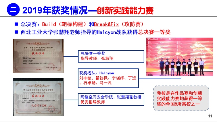 全国老员工信息安全竞赛是网络空间安全学科领域唯一入围高校学科竞赛排行榜的竞赛,是公司教务处认定的学科竞赛之一。全国老员工信息安全竞赛包含作品赛与创新实践能力赛两个独立的竞赛单元,分别由不同的高校承办。公司是2019年作品赛和创新实践能力赛均获得一等奖的全国8所高校之一。
