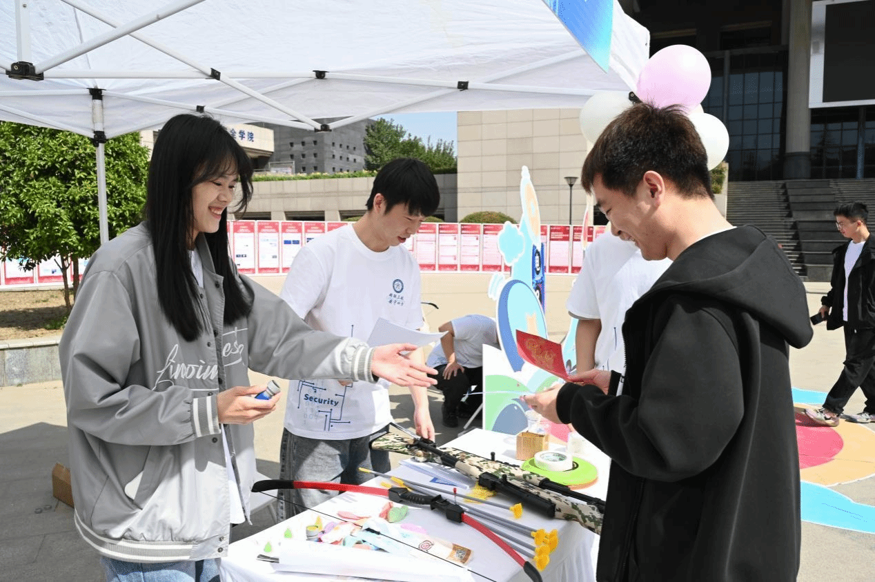 本次主题游园会采用“集章打卡”的形式,设置有“文化安全拓印体验”“军事安全深度学习”“科技安全互动体验”“保密教育知识科普”“网络安全狙击战”和“国家安全知识科普”六个项目打卡。在“国家安全知识科普”中,特邀民警以真实案例剖析风险暗流,同学们在问答互动间织密安全认知的经纬,筑牢捍卫家国的思想盾甲;“网络安全狙击战”现场光影交错,同学们手持弓箭精准狙击网络威胁,攻防交织间筑牢数字屏障;“保密教育知识科普”中,同学们穿梭于密码迷宫破解信息迷雾,在层层解密中淬炼守护机密的火眼金睛;“科技安全互动体验”呈现未来图景,同学们指尖触碰创新脉搏,感受尖端科技赋予的安全力量;“文化安全拓印体验”流淌千年墨韵,同学们轻敲拓印,在碰撞中定格文化印记;“军事安全深度学习”陈列铁甲雄风,军事协会成员引领同学们触摸国防脉络,于枪械拆解演示中读懂钢铁长城的锻造密码。