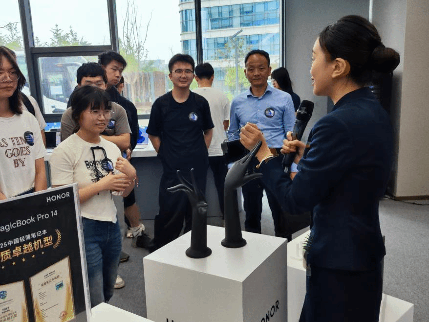 紧接着,研发中心工作人员对西安研发的电子产品展开系统介绍,详细阐述其功能特性与技术创新点。MagicOS系统的多设备协同演示引得阵阵赞叹,而基于端侧大模型的实时翻译功能更让同学们体验到AI技术的温度。荣耀产品诸如智能互联、AI 智能识别等创新成果,极大激发了同学们对未来科技发展的憧憬与期待。