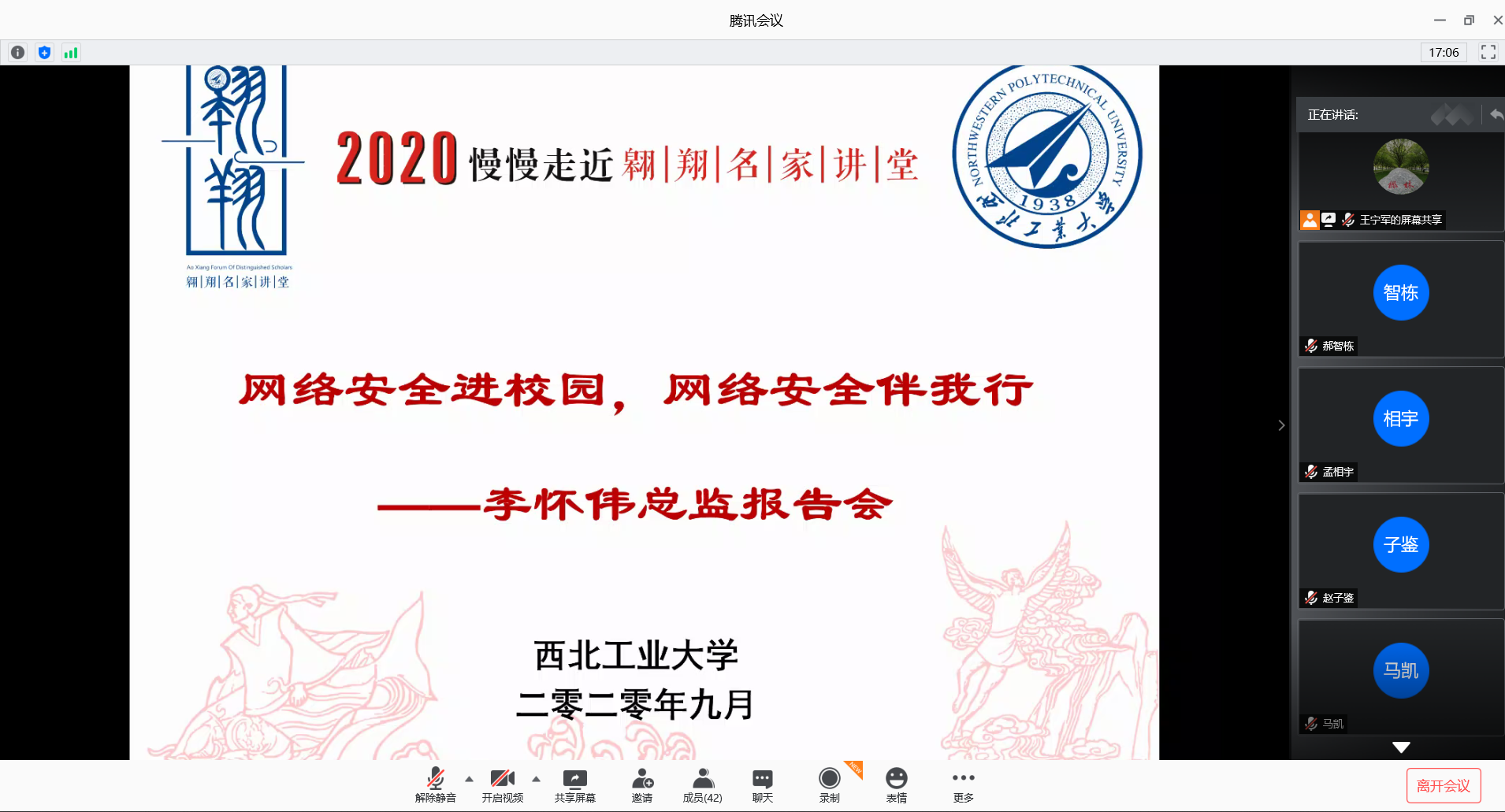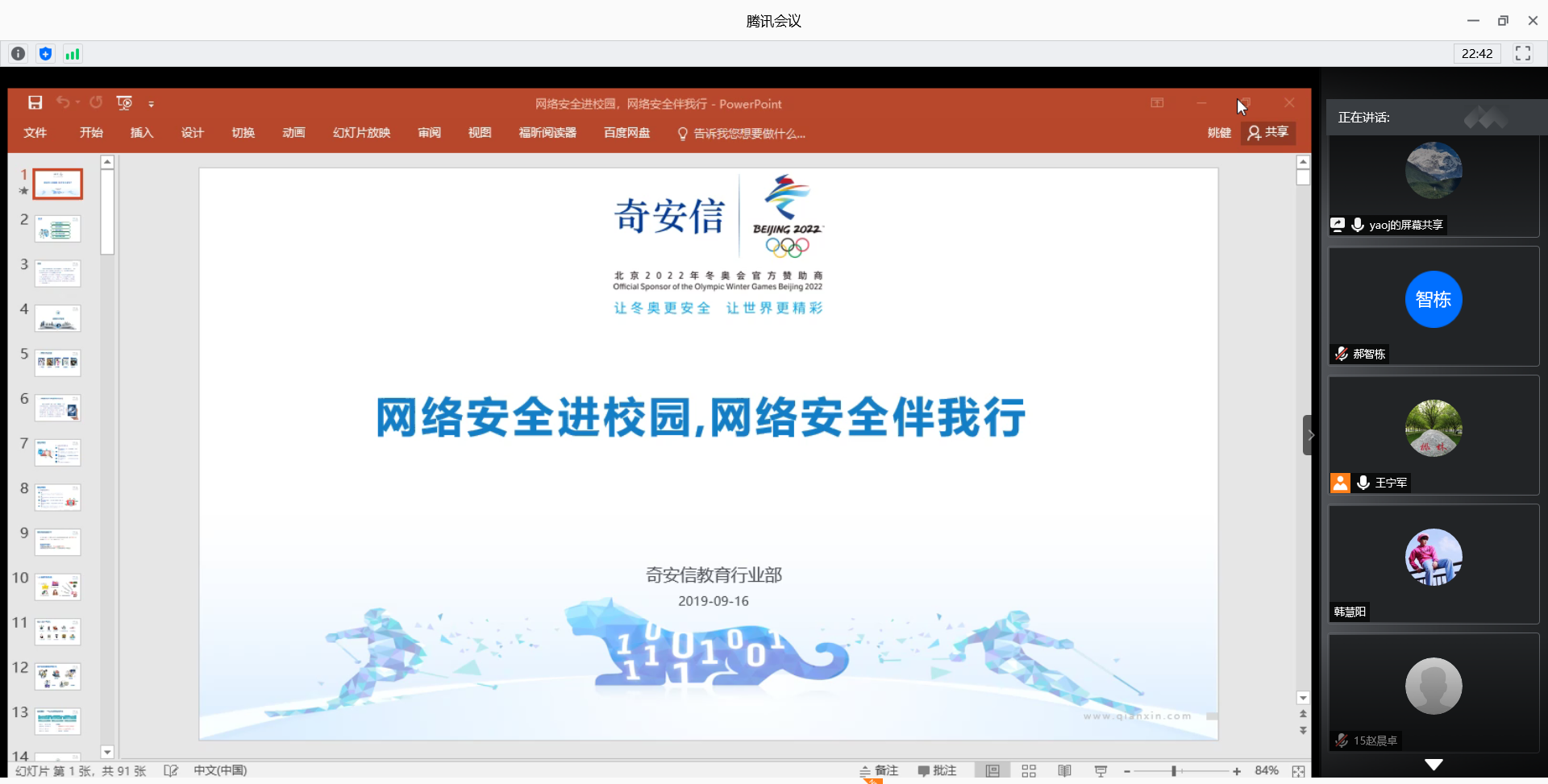 随着第七届国家网络安全宣传周的到来,9月16日下午,公司邀请奇安信集团教育行业部总监李怀伟作了一场题为“网络安全进校园,网络安全伴我行”的线上科普讲座,这是公司“翱翔名家讲堂”系列活动之一。报告会由党委员工工作部主办,太阳成tyc122cc、计算机公司和软件公司承办。网络空间安全公司党总支副书记王宁军主持报告会,全校200余名员工参加了报告会。