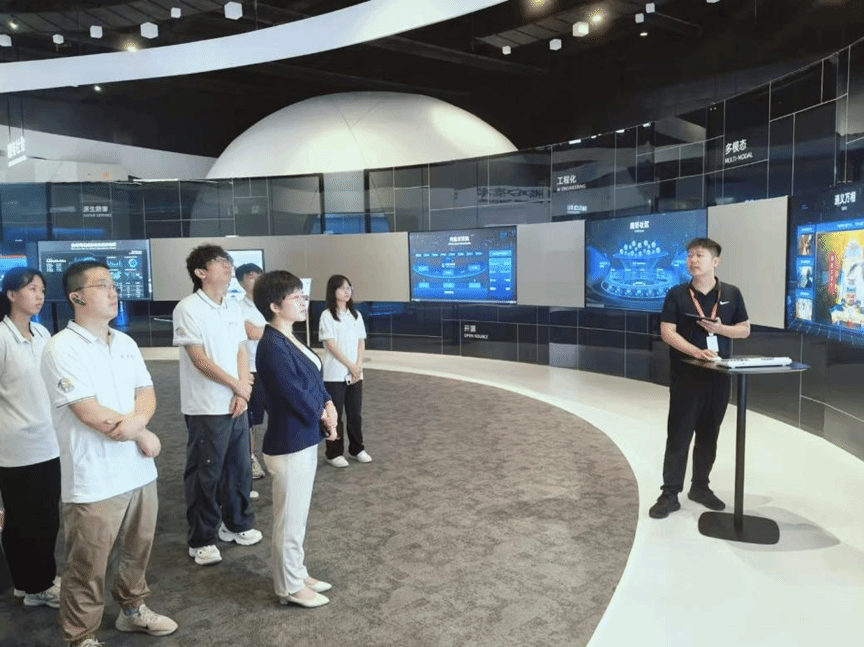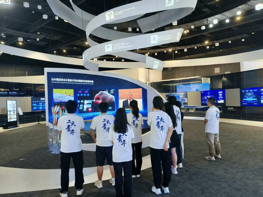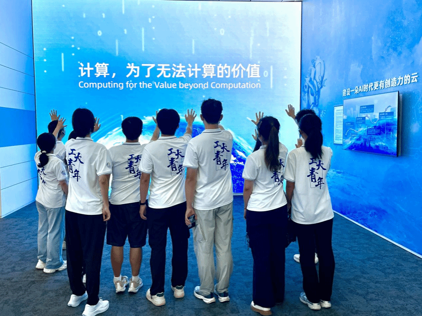 进入阿里云园区后,讲解员带领实践队参观了阿里云展厅,介绍了阿里云的企业文化和发展历程。跟随讲解员的脚步,同学们了解了阿里云以“全面拥抱AI”为特色的一系列服务产品和以“云计算推动科技创新”为指引的关键技术突破,并亲身感受了阿里云以AI驱动的云计算技术给生活带来的便捷。