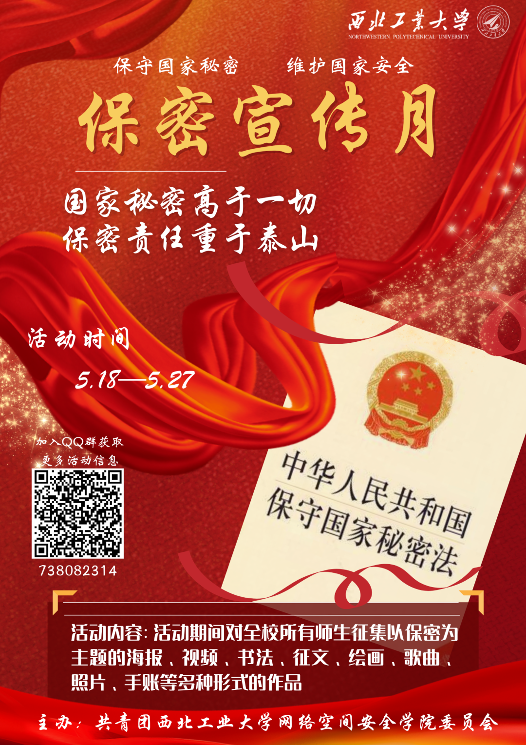 5月18日至5月27日,太阳成tyc122cc举办“保密,你我共同参与”主题征集活动,面向全校师生征集以保密为主题的海报、视频、书法、征文、绘画、歌曲、照片、手账等创意作品,形式不限。同学们以在亲身参与中学习提高的方式,更深入了解保密工作相关法律法规,树立良好的保密意识。活动开展以来,同学们积极参与,提交的作品形式新颖多样,内容丰富,立意深刻。通过本次活动,同学们对保密有了更深刻的体会,学到了与保密相关的新知识,在校园中营造了积极宣传保密意识的良好氛围。