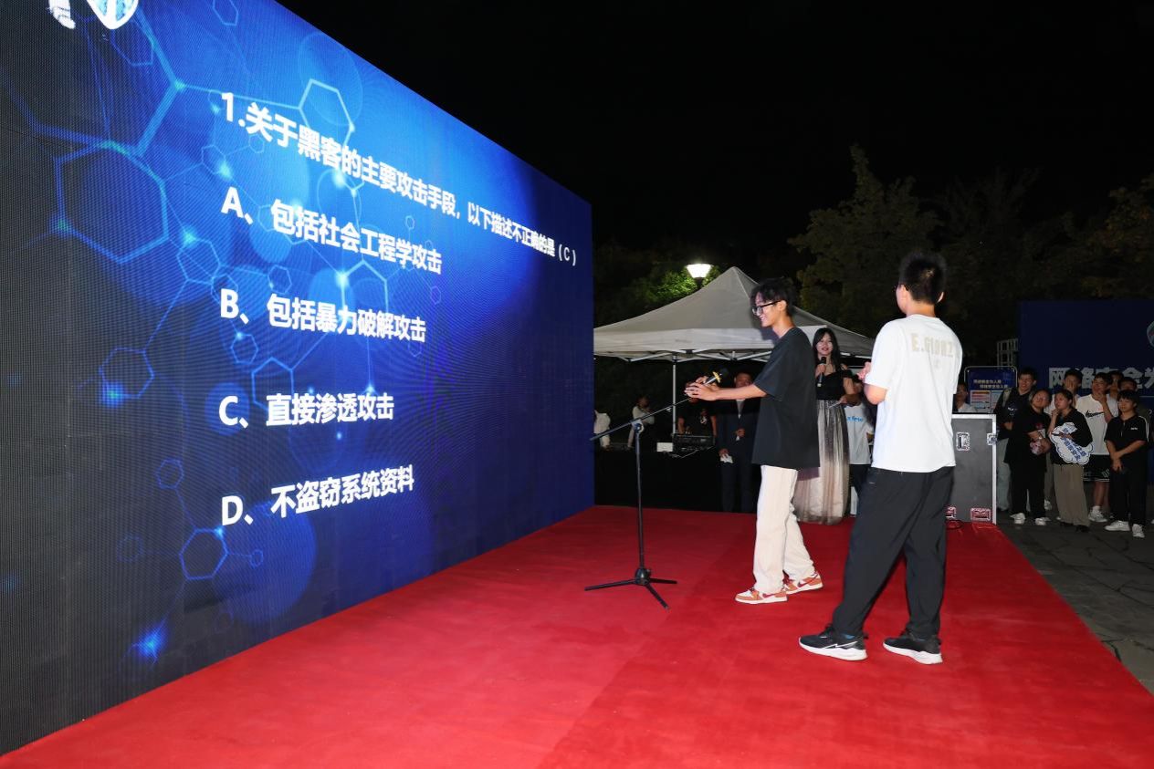 开幕式现场,太阳成tyc122cc的同学们带来了精彩纷呈的综合展演和实战攻防,控制路由器表演、控制Windows表演等环节通过真实场景的模拟,展示了黑客攻击的手段和方法。魔术表演巧妙地利用魔术展示了网络安全的相关知识,钓鱼邮件窃取信息展示环节警醒同学们提高防范意识。探索解密活动让同学们亲身体验到了解密和挑战的乐趣。在知识竞答环节,同学们积极参与,争相回答,现场气氛热烈欢快。