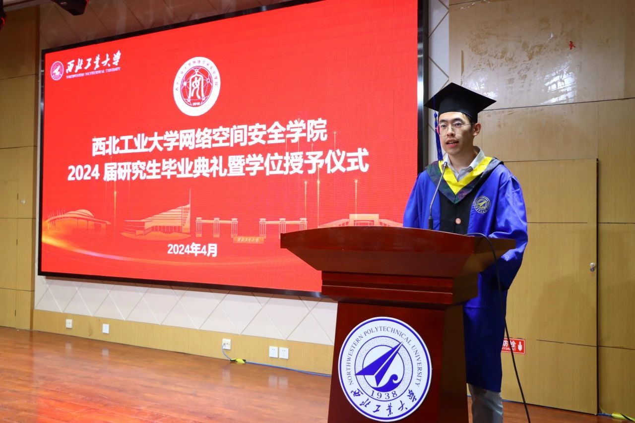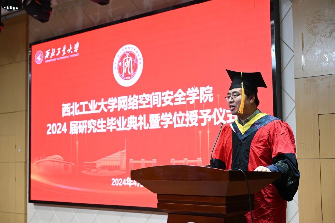 导师代表胡伟教授对即将毕业的同学们表达了最诚挚的祝福,并从“铸剑南山之下”“师出西岳之巅”“翱翔寰宇之内”“网安天下之际”四个方面表达了对2024届毕业生们的肯定、赞美、鼓励和希望。勉励大家始终牢记没有网络安全就没有国家安全。西工大网安院永远是大家共同的家园,欢迎大家常回家看看。