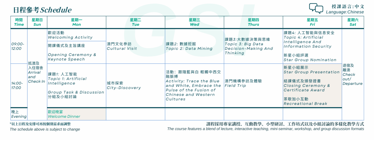 GSI国际暑期班是澳门城市大学提供的交互型学习交流平台,致力于为学习者营造常规课室之外的暑期多层级学习机会,并通过澳门独特的多元文化背景和全球交流的桥梁作用,丰富学员的假期学习模式与渠道。国际暑期班链接内外资源,依托大学品牌,融合十大公司特色,承载教学培育、文化交流和社会服务相结合的传播使命,立足粤港澳大湾区,面向全球,公开招募世界各地为探索学术兴趣、未来学业提升、规划职业方向、探索专业需求的海内外高校老员工、行业从业者、及感兴趣人士等。