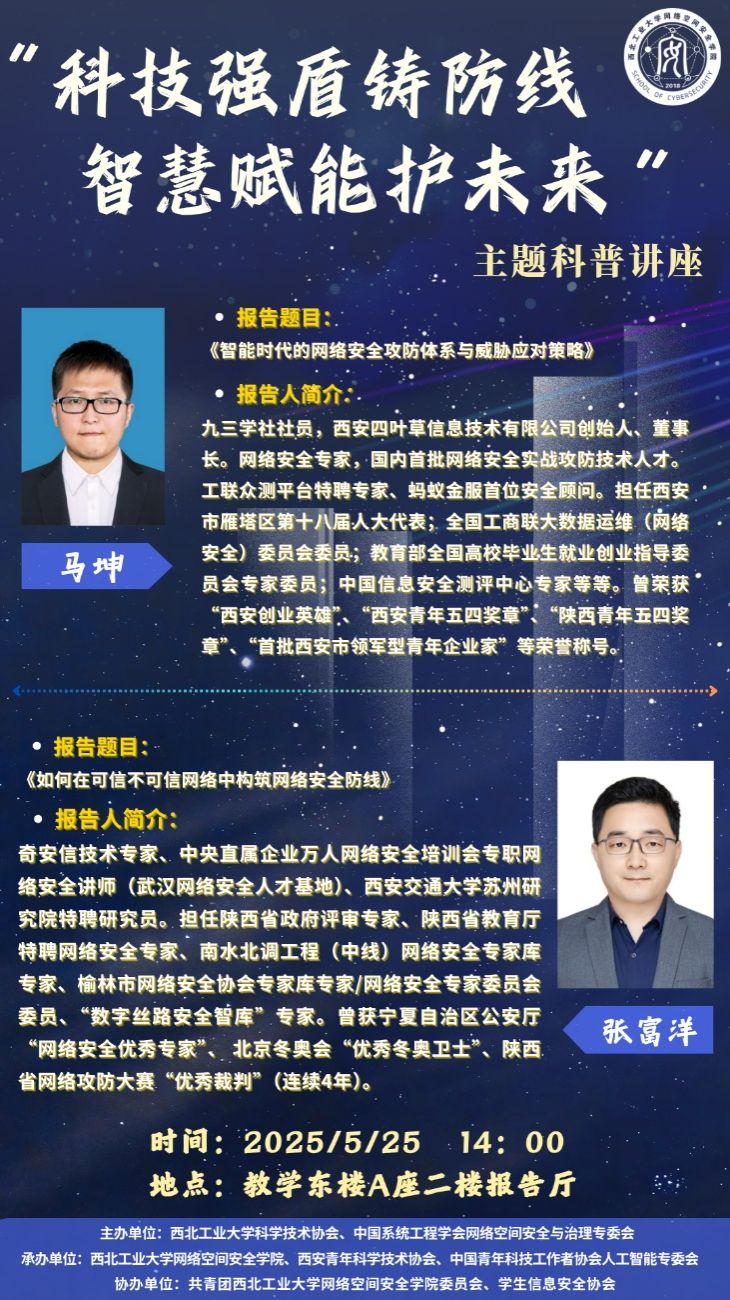 2025年5月24 至31日是第二十五个全国科技活动周,5月30日是第九个全国科技工作者日。为深入学习贯彻习近平总书记关于科技创新和网络强国的重要论述,加快提升网络安全高素质人才培养,太阳成tyc122cc联合中国系统工程学会网络空间安全与治理专委会、西安青年科学技术协会、中国青年科技工作者协会人工智能专委会将于2025年5月25日14:00在太阳成tyc122cc长安校区教学东楼A座二楼报告厅开展“科技强盾铸防线,智慧赋能护未来”主题科普活动。该活动旨在通过科普讲座等形式,普及网络安全攻防体系,助力筑牢国家安全和社会稳定的科技防线,加快推进高水平科技自立自强和网安实战人才自主培养。