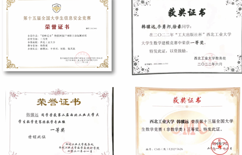 In the freshman and sophomore years, he kept the first place in the grade and won the National Scholarship, first-class Scholarship of the university, Outstanding University student, Outstanding Communist Youth League member, many advanced individuals and other honors. He also has been awarded Five prizes in national and provincial discipline competitions, and more than ten prizes have been awarded at the university level.