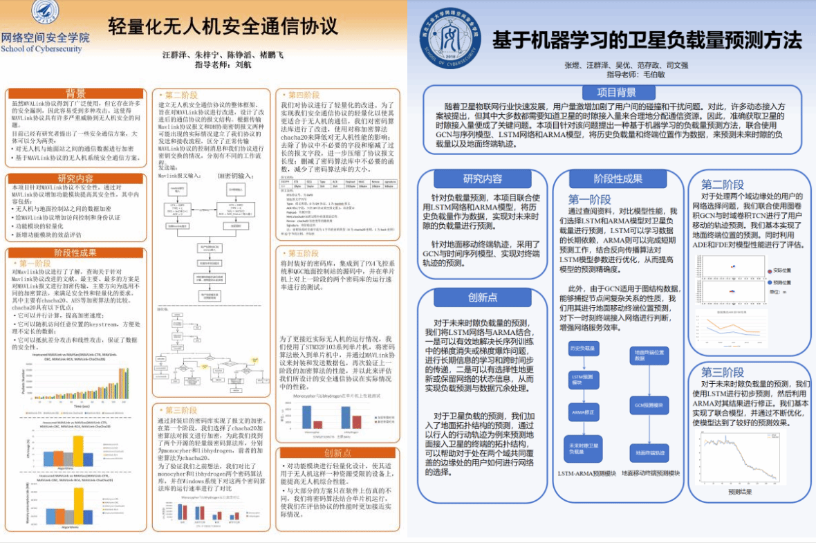 汪群泽深耕信息领域,作为大创省级优秀项目《轻量化无人机安全协议》的负责人:突破MAVLink协议安全瓶颈,设计含访问控制与认证模块的加密传输全流程,将加密算法部署至单片机实现性能优化;作为核心成员完成大创校级项目《卫星负载量预测》,创新融合GCN、LSTM与ARMA模型,利用历史拓扑数据实现低轨卫星负载量动态预报;其论文成果《高效隐私保护的跨模态医疗检索》更破解医疗数据孤岛难题,通过密文相似性比对协议与分层索引结构,在保障抗选择明文攻击安全性的同时,将加密医疗数据检索效率提升至亚线性级。