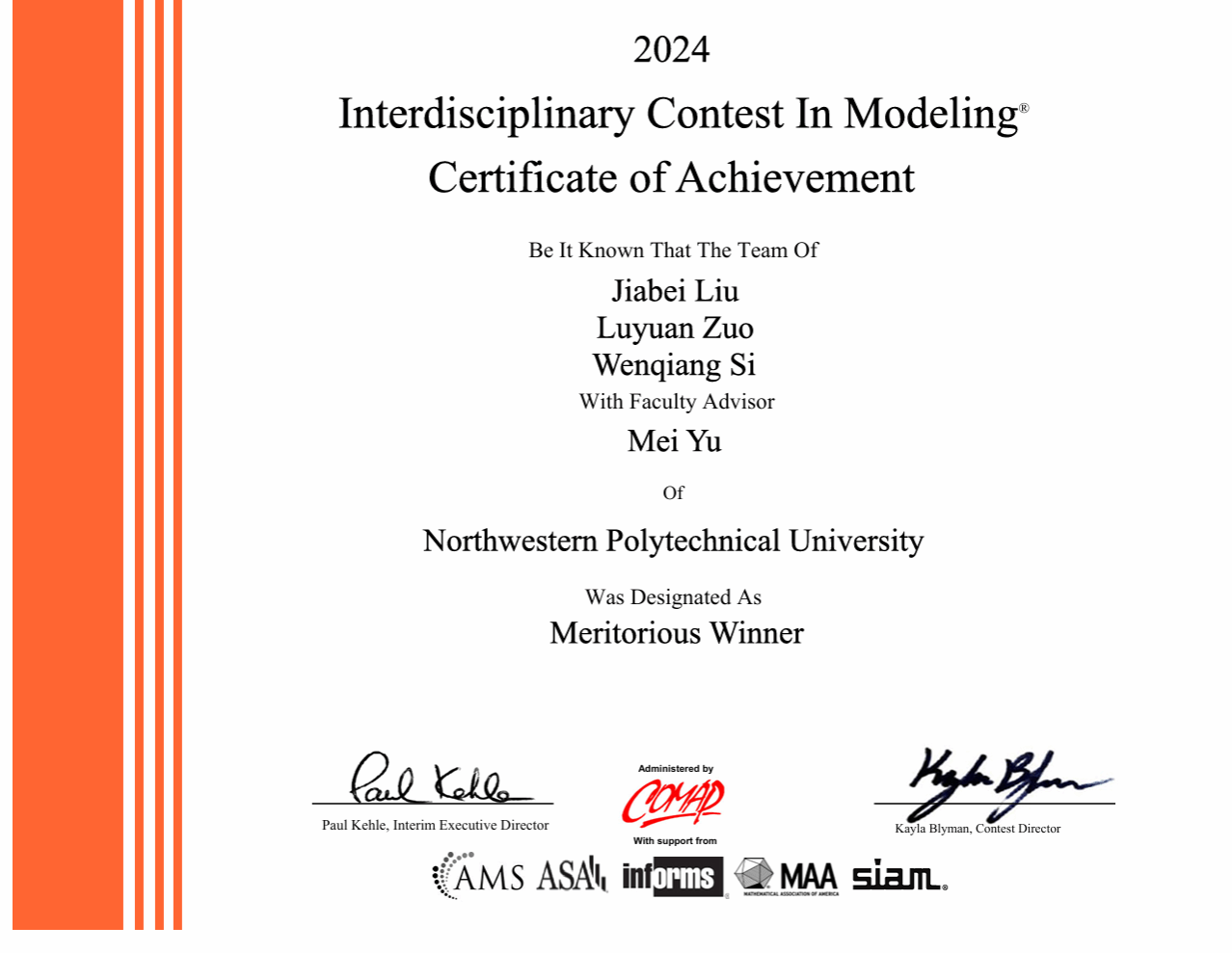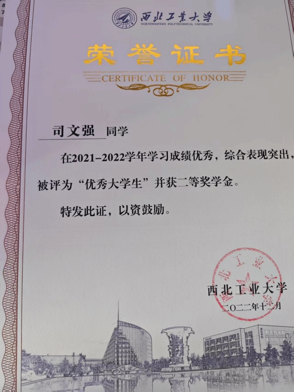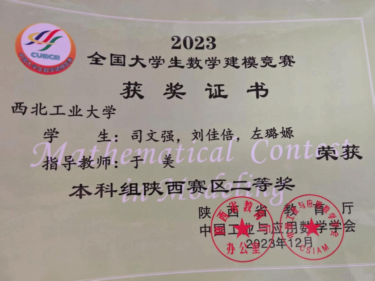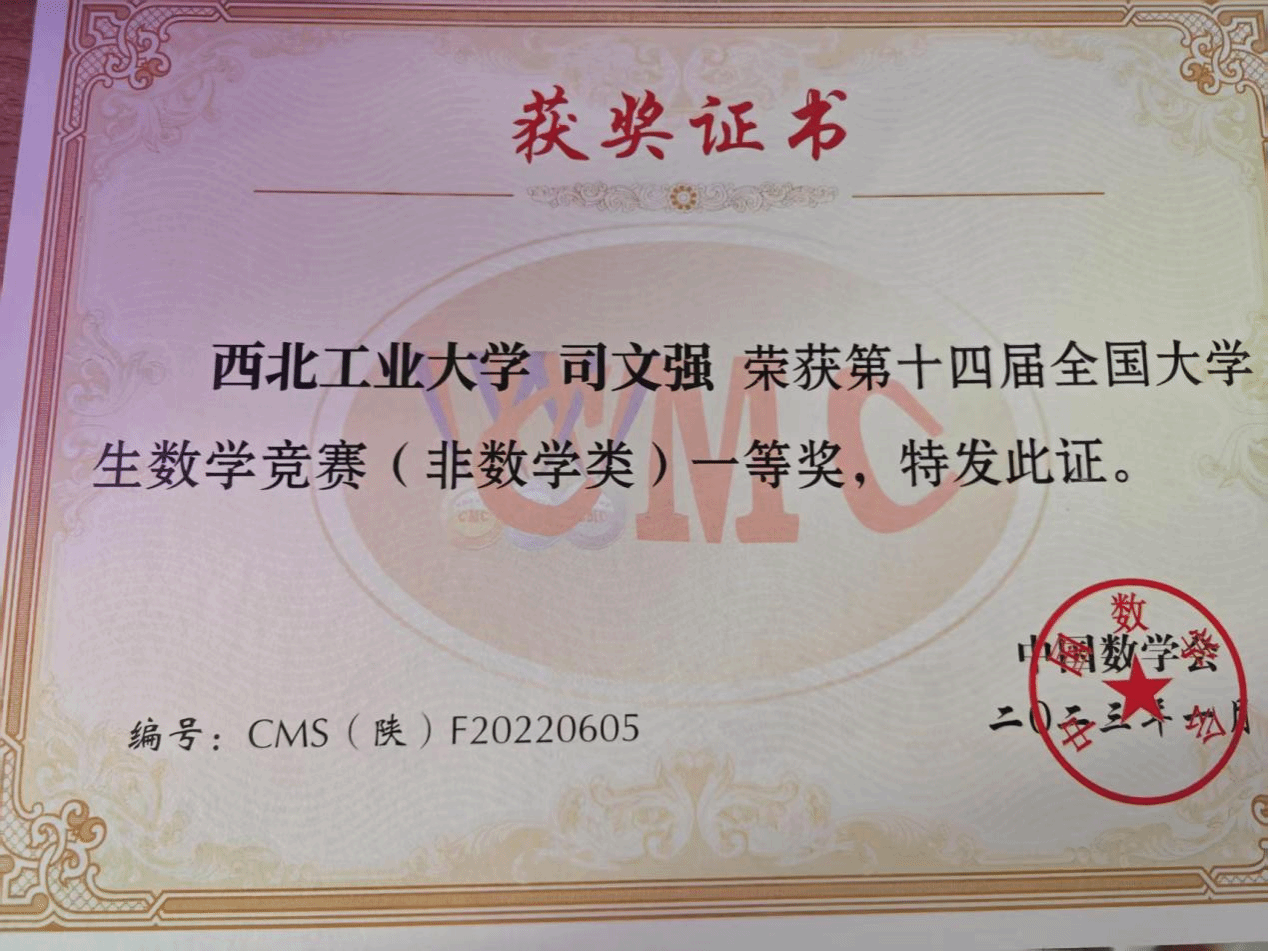 司文强始终秉承踏实勤奋的学风,热衷于参加各类学科竞赛。本科期间,积极参与数学相关竞赛,带领队伍多次参加数模竞赛,主要负责编程和建模工作,取得了陕西省二等奖、美赛M奖的优异成绩;积极参与数学竞赛,取得了省级一等奖的优异成绩。同时,司文强积极参与全国老员工创新创业大赛、互联网+,在实践中提升自己的科研能力。