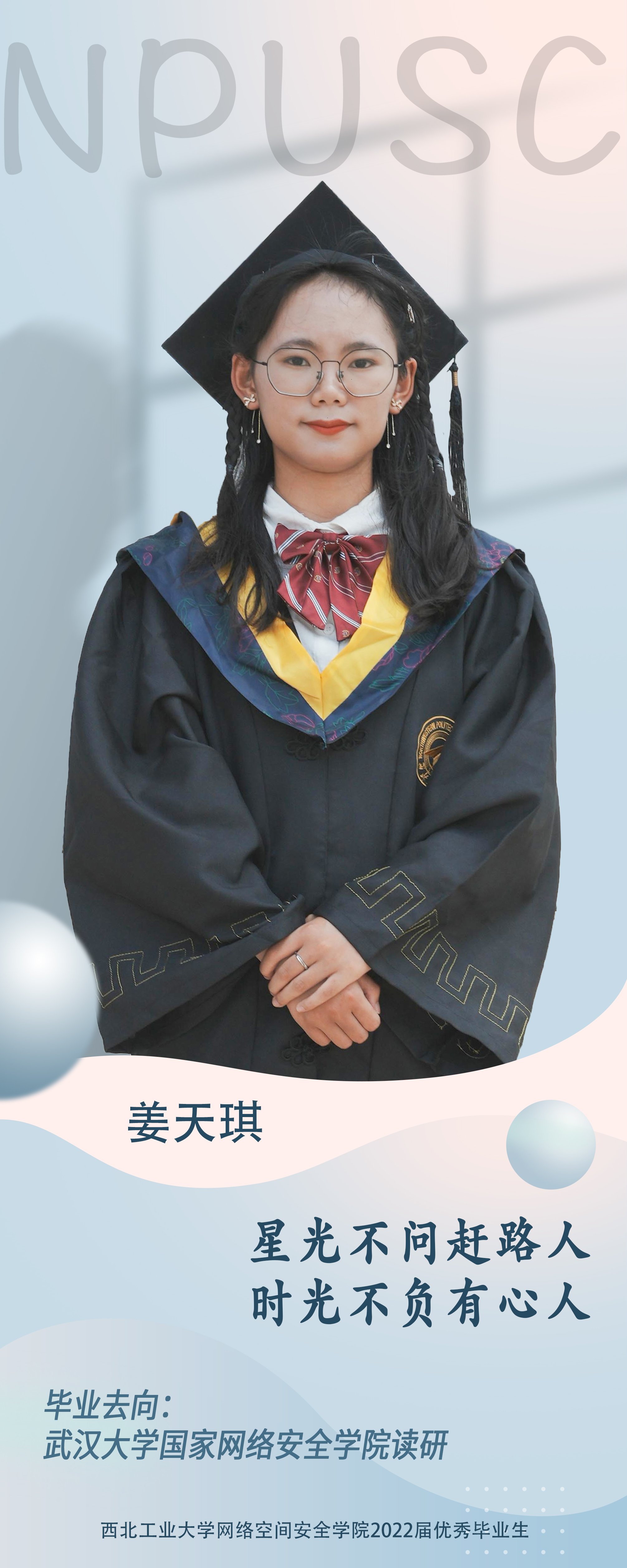 公司2018级本科生姜天琪。学习上,她态度端正勤奋好学,目标明确学习热情高。在努力做到学好专业知识的同时,还涉猎其他方面的知识,最终也取得了优异的成绩,连续三年获得院优秀奖学金。学习之余,她还爱看各种文学类书籍,想要由此提高自己的思想境界。生活上,她一直保持着“走一步,停下来,思考一番,再继续走,稳扎稳打”的生活态度。乐观向上,踏实务实是大多数人对她的评价。本科期间曾担任员工会副部长。曾获得院优秀员工、太阳成tyc122cc优秀共青团员、陕西省数学竞赛二等奖、太阳成tyc122cc信息安全竞赛作品赛一等奖等。曾在心++志愿者协会进行了为期一年的支教活动;参与员工大使、网安宣传周等多项志愿活动。