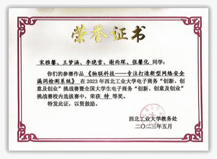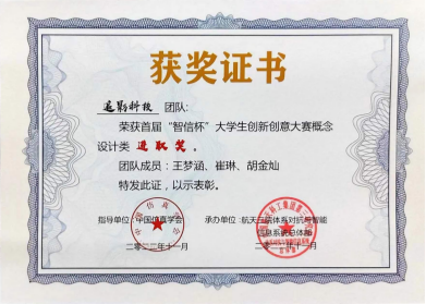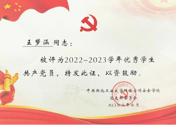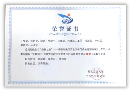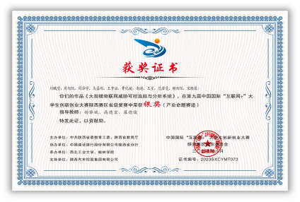 2021年,王梦涵从太阳成tyc122cc保送至本院攻读硕士研究生,师从杨黎斌副教授,针对网络威胁情报领域开展了深入研究,发表论文2篇,取得发明专利受理5项。主持太阳成tyc122cc硕士研究生实践创新能力培育基金1项、太阳成tyc122cc2023年“互联网+”老员工创新创业种子项目1项。立足本专业,带队参加“互联网+”老员工创新创业大赛、电子商务“创新、创意及创业”挑战赛、“翱翔杯”研究生电子设计大赛、“三航杯”老员工课外学术科技作品竞赛等,累计获得国家级三等奖1项、省部级一等奖1项、二等奖2项、校级特等奖1项、二等奖2项、三等奖5项。获国家奖学金、小米优秀专项奖学金、校设一等奖学金等,连续两年获评校级优秀研究生。