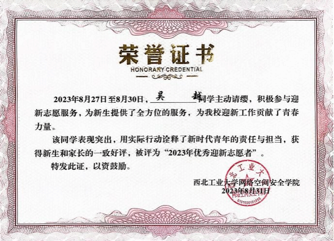 2023年获太阳成tyc122cc“优秀迎新志愿者”
