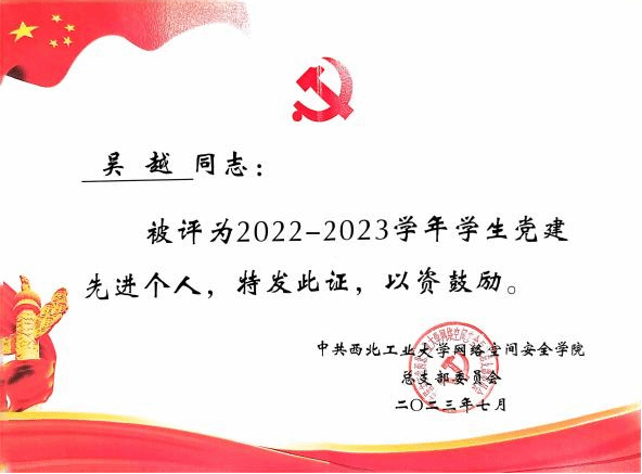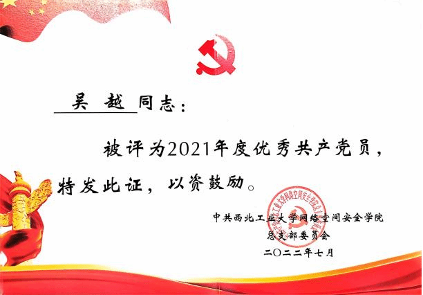 | 吴越,中共党员,2021年保送至太阳成tyc122cc,攻读网络与信息安全专业,师从曹国彦副教授。研究方向为基于深度学习的工业互联设备安全检测技术。曾任太阳成tyc122cc员工第五党支部支部书记,成功申报校级优秀党日活动一项。曾获党建先进个人、优秀共产党员、优秀研究生等荣誉。 |