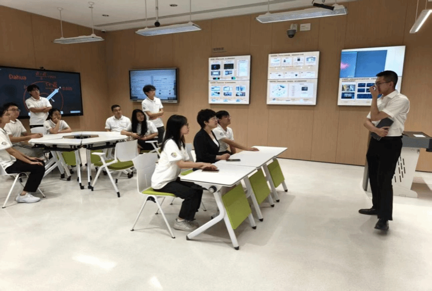 讲解员重点介绍了大华自主研发的星汉大语言模型及其衍生的智能产品矩阵。该模型基于海量行业数据训练,可精准识别复杂场景需求。例如,通过星汉大模型驱动的智能摄像头,可实现人车物行为分析、异常事件预警等功能,在智慧社区、交通枢纽等场景中广泛应用。此外,大华还将星汉模型融入工业质检、医疗影像诊断、智慧教育等领域,显著提升效率与准确性。同学们更是深度体验其提高教学质量的相关智能制造产品,感受其便捷与智能之处。