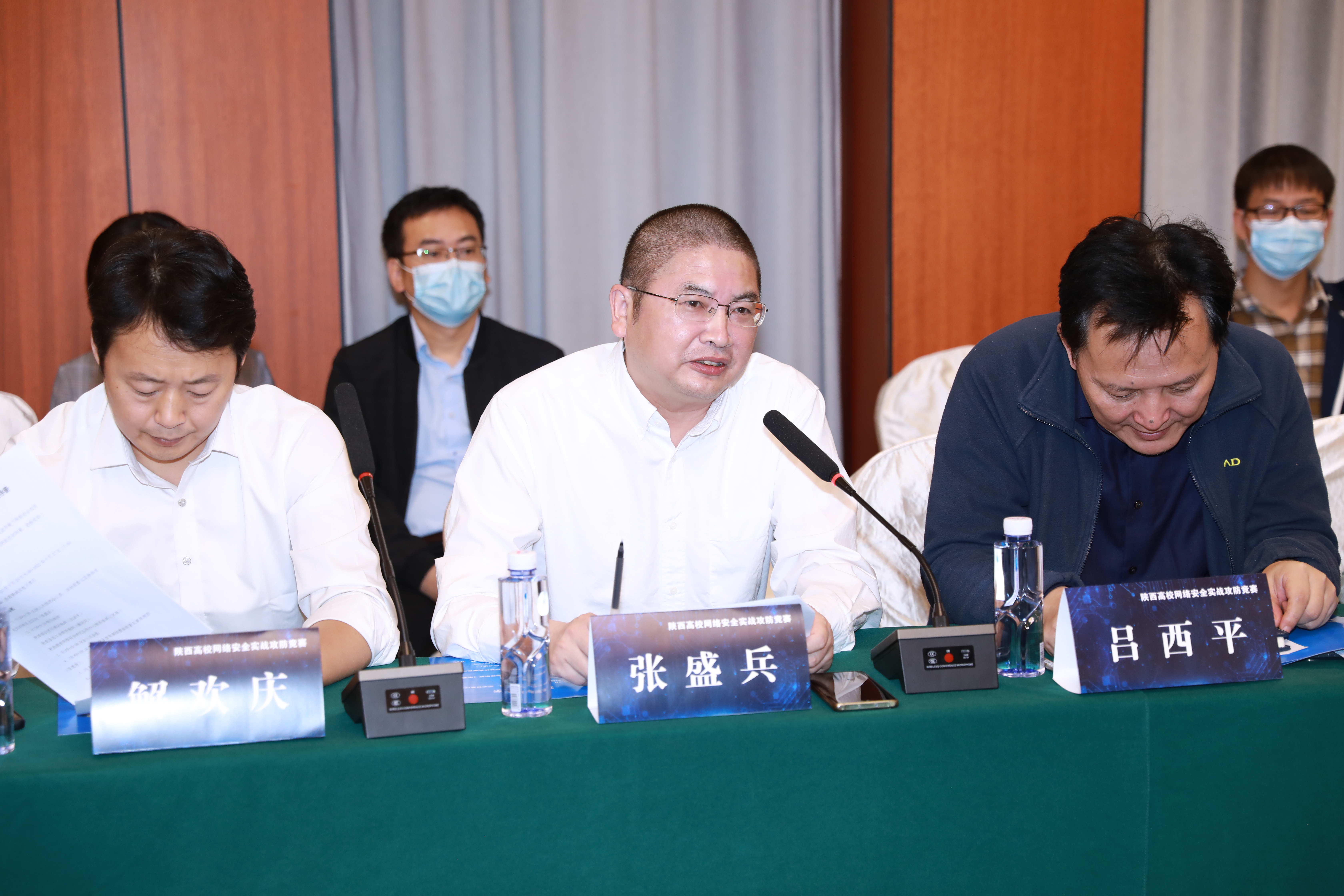 随后,陕西省公安厅领导吕西平、总工会领导解欢庆、陕西网络安全研究应用中心领导宋强分别致辞。三位领导表达了对各位高校老师以及各支参赛队伍的欢迎,强调了在党的二十大召开前夕举办此次比赛的重大意义,希望各支队伍恪守程序、展现风采,不断提升实战能力,守卫网络安全阵地,为党的二十大献礼。