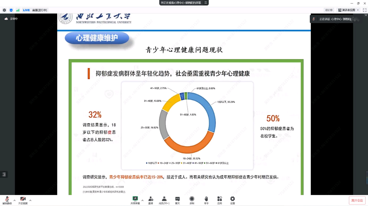 本次讲座由员工心理健康教育中心郭鹤阳老师担任主讲人。郭鹤阳老师从新生学习生活中的学习阶段和学习挑战入手,介绍了诸多青少年心理健康问题的现状,强调了心理健康的重要性,同时详细深入阐述了正确的心理调节方法。