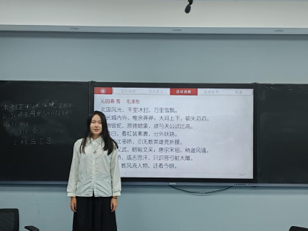 进入诗歌朗诵环节,丁中惠同学朗诵毛泽东主席所写诗篇《沁园春·雪》,感情饱满,抒发了对祖国壮丽山河的热爱,同时,积极引导同学们分享收获和体会。