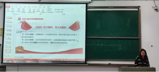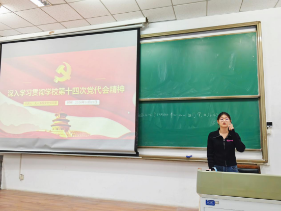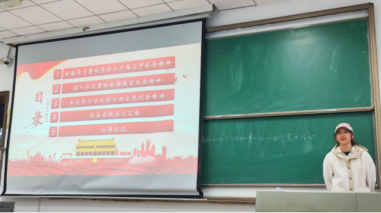首先由2021级本科生党支部的宋述钰同学领学党的二十届三中全会精神。她从八个方面概述了《中共中央关于进一步全面深化改革 推进中国式现代化的决定》的主要内容,二十届三中全会明确提出要进一步全面深化改革,促进不同所有制经济的优势互补与共同发展,并重点强调了加快建设高标准市场体系的三项关键改革举措。此外,她还带领大家学习了教育综合改革、科技体制改革、人才发展体制机制改革的最新要求,鼓励同学们将学习成果转化为实际行动,积极投身到学习与生活实践中去,坚定理想信念、勇担历史使命,为实现中华民族伟大复兴的中国梦贡献自己的力量。