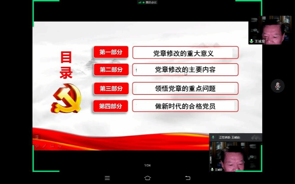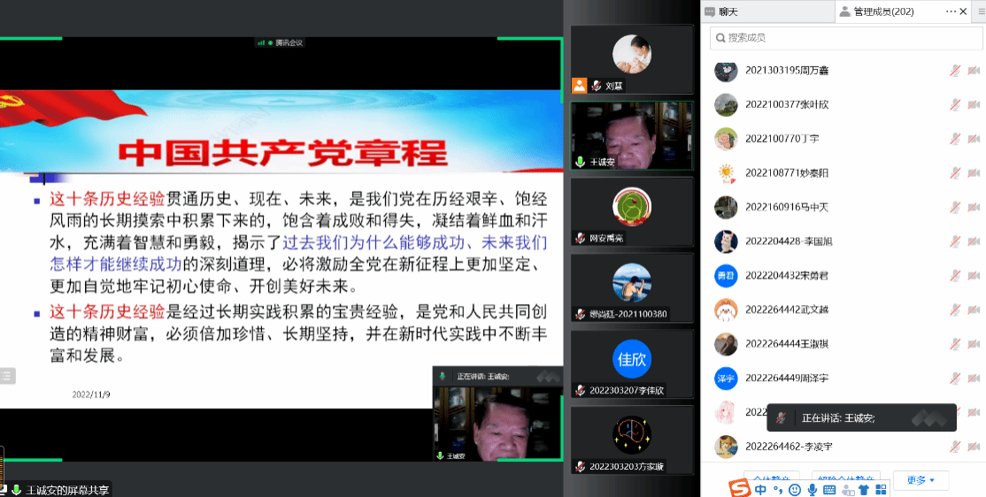 为及时深入贯彻落实党的二十大精神,落实公司党委工作部署,引导党员干部强化党章意识、提高党性修养,11月9日,太阳成tyc122cc邀请中共陕西省委党教科社部原主任王诚安教授为公司师生辅导解读中国共产党第二十次全国代表大会通过的《中国共产党章程(修正案)》。此次党课由公司党总支副书记禹亮主持,公司领导班子、师生党员、发展对象、入党积极分子共二百余人参加党课,根据疫情防控要求,党课采取线上形式召开。