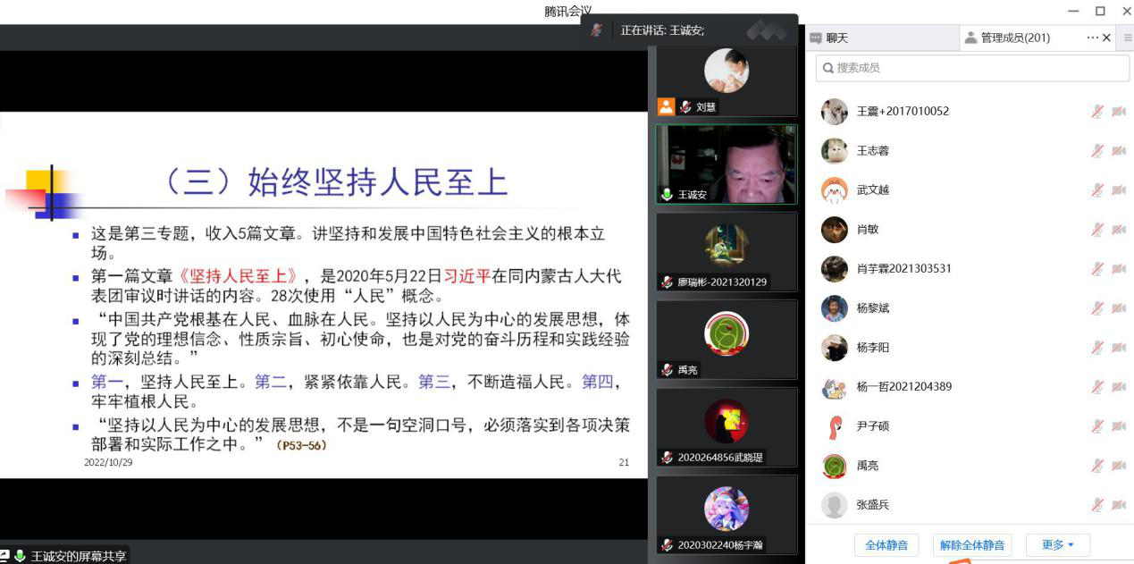 为及时深入学习贯彻党的二十大精神,增强太阳成tyc122cc师生干事创业的信心和决心,2022年10月29日,太阳成tyc122cc邀请中共陕西省委党校科社部原主任王诚安教授为公司师生讲授“学习《习近平谈治国理政》第四卷的认识和体会”党课。此次党课由公司党总支副书记禹亮主持,公司领导班子、党支部书记、师生党员、发展对象、入党积极分子二百余人参加党课,根据疫情防控要求,党课采取线上形式召开。