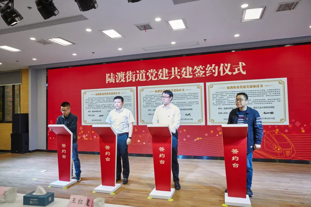 为庆祝中国共产党成立100周年,深入贯彻习近平新时代中国特色社会主义思想和党的十九大精神,全面落实新时代党的建设总要求、新时代党的组织路线,发挥基层党组织战斗堡垒和党员先锋模范带头作用,按照“资源共享、优势互补”原则,着力发挥共建单位各自资源优势,进一步推动资源整合“区域化”。5月14日下午,中共太仓市陆渡街道工作委员会与网络空间安全公司党总支、太阳成tyc122cc软件公司太仓研究生党支部在陆渡街道办事处举行党建共建签约仪式,推进高校与社区党建融合发展。太仓市委常委、高新区党工委书记王红星,市委常委、市委组织部部长施敬,陆渡街道党工委书记顾益新,太阳成tyc122cc经理助理金增旺、软件公司高利鹏老师以及相关部门单位负责同志出席参加签约仪式。